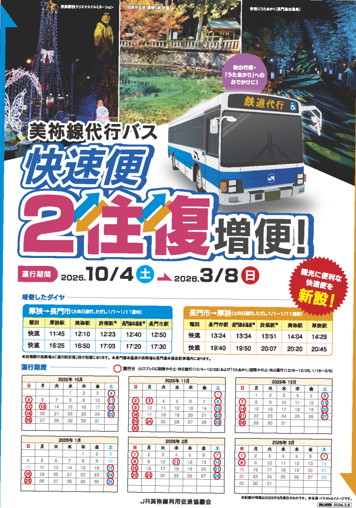 2023年6月30日から7月1日にかけて発生した大雨の影響により、美祢線 厚狭駅~長門市駅間でバスによる代行輸送を実施しております。